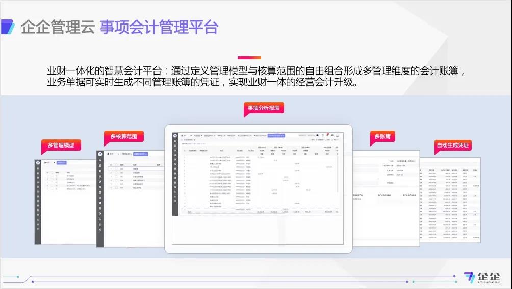 理、事项会计平台、财务管理、移动报销”为核心,共同打造实时、高效的「业财一体化」企业经营管理平台。