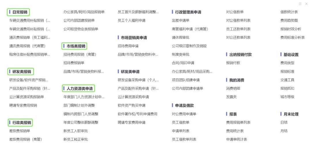 比如,工数将「费用报销」模块进行改造,设置成按报销属性分类的子模块:日常费用报销、研发费用报销、市场营销类报销;同时,还有对应的“日常费用申请单、研发费用申请单、市场营销费用申请单”等,做到申请单和报销单一一对应,避免同一个申请单,对应多类报销单,员工填单混乱,审批人员也容易纠结合不合适等问题。
